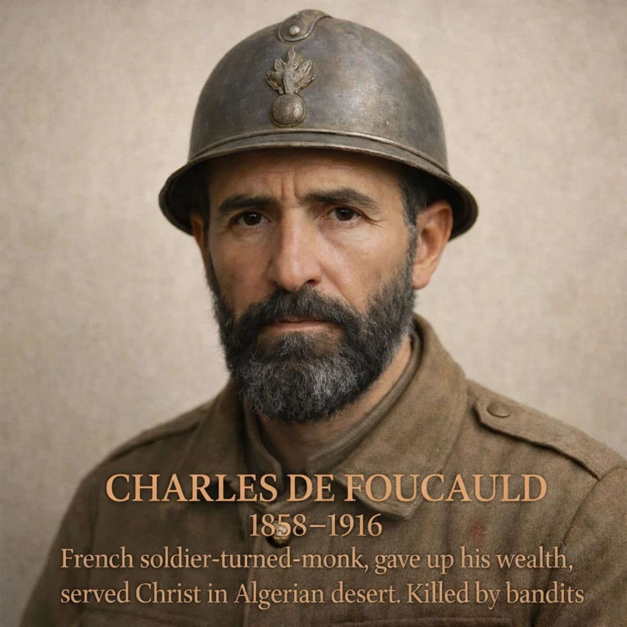 Charles de Foucauld (1858–1916) was a French soldier-turned-monk, once known for reckless indulgence before surrendering fully to Christ. After a dramatic conversion, he gave up wealth and title to live among the poorest of the poor in the Algerian Sahara. There, he embraced a life of prayer, silence, and self-sacrificial love, reflecting the hidden life of Jesus in Nazareth. Living simply as a hermit, he sought not to preach aloud but to embody the gospel through presence and humility.